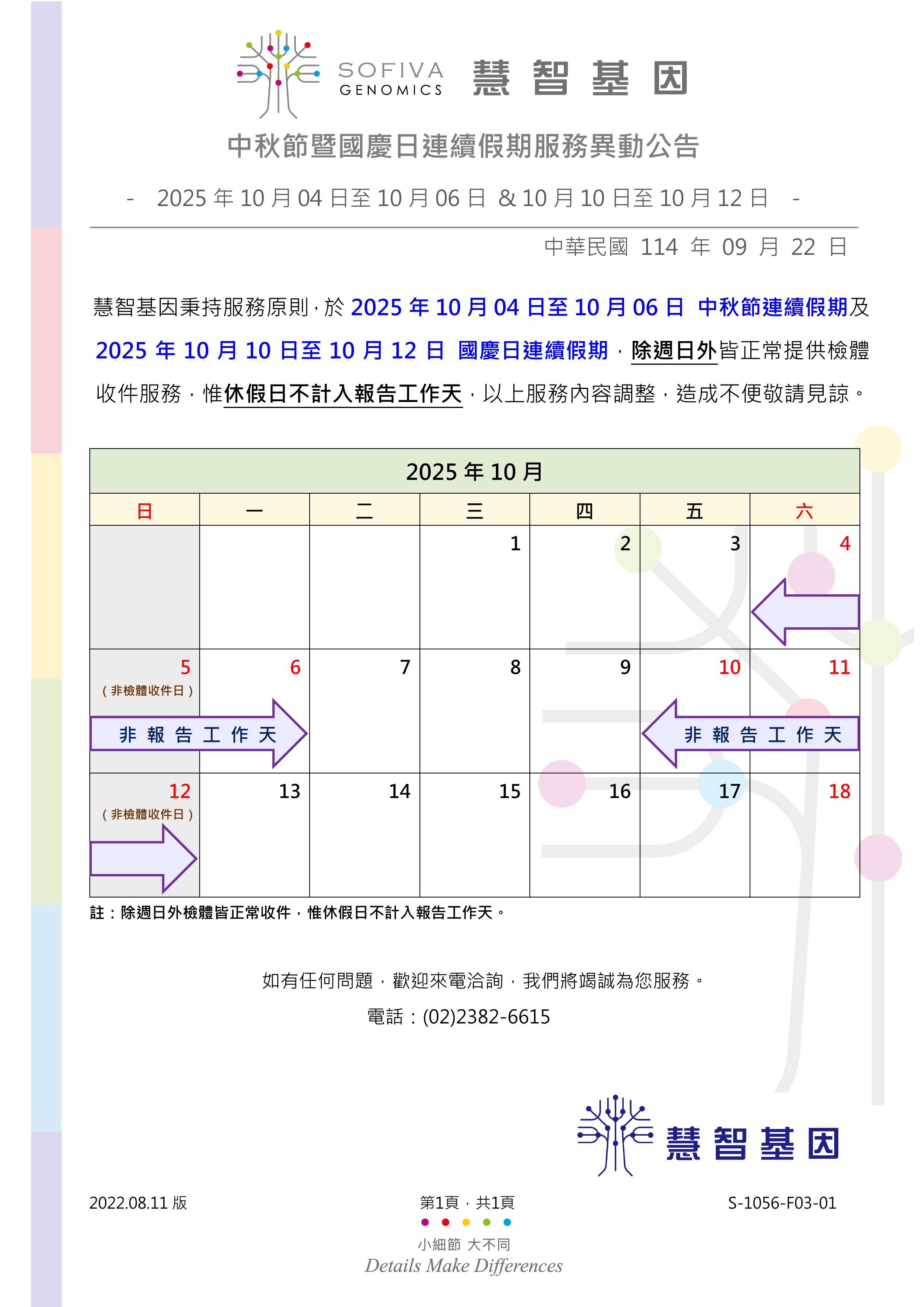 慧智基因秉持服務原則,於2025年10月04日至10月06日中秋節連續假期及2025年10月10日至10月12日國慶日連續假期,除週日外皆正常提供檢體 收件服務,惟休假日不計入報告工作天,以上服務內容調整,造成不便敬請見諒。