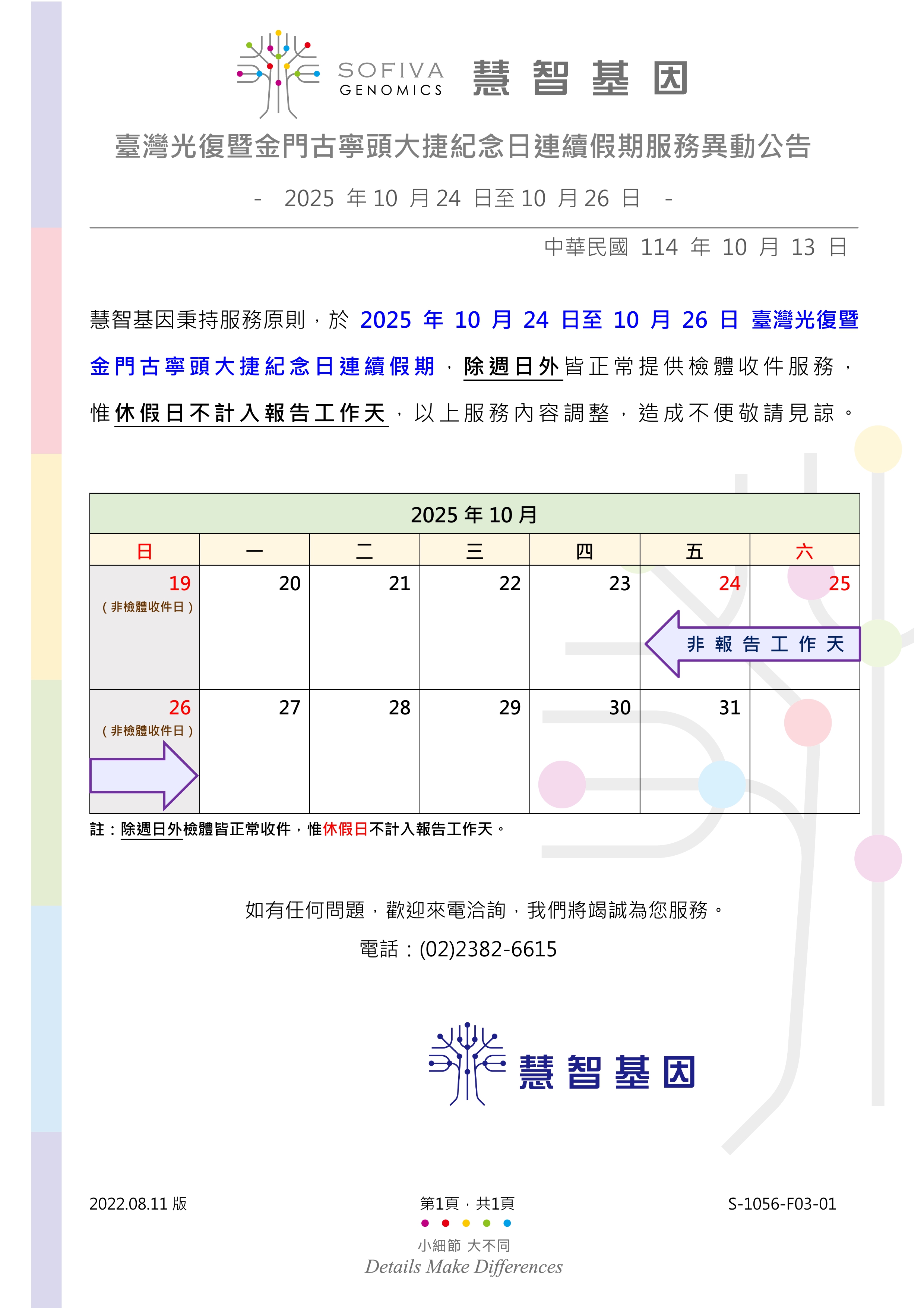 慧智基因秉持服務原則,於2025年10月24日至10月26日 臺灣光復暨金門古寧頭大捷紀念日連續假期,除週日外皆正常提供檢體收件服務,惟休假日不計入報告工作天,以上服務內容調整,造成不便敬請見諒。