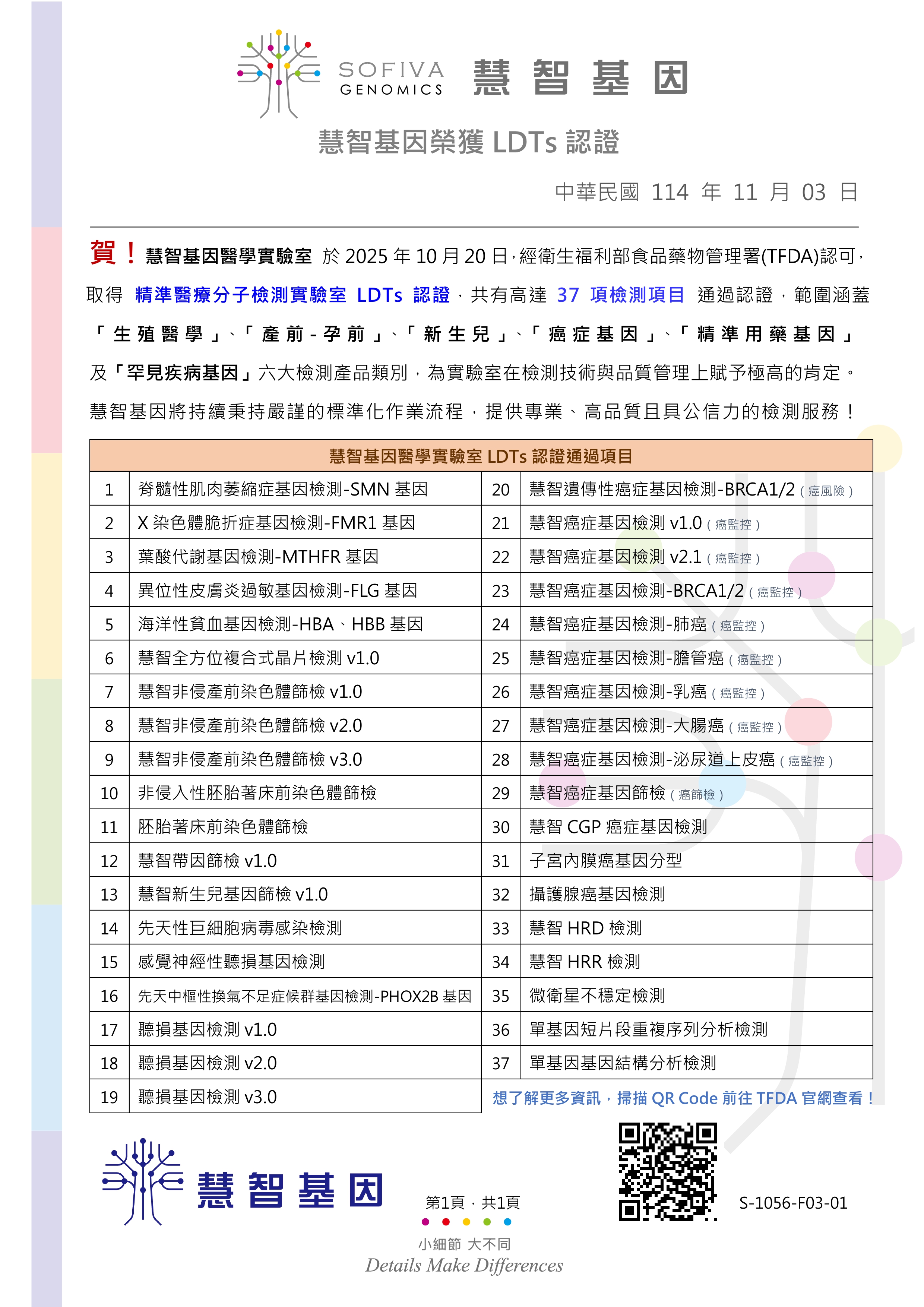 賀!慧智基因醫學實驗室 於2025年10月20日,經衛生福利部食品藥物管理署(TFDA)認可,取得精準醫療分子檢測實驗室LDTs認證,共有高達37項檢測項目通過認證,範圍涵蓋「生殖醫學」、「產前-孕前」、「新生兒」、「癌症基因」、「精準用藥基因」及「罕見疾病基因」六大檢測產品類別,為實驗室在檢測技術與品質管理上賦予極高的肯定。慧智基因將持續秉持嚴謹的標準化作業流程,提供專業、高品質且具公信力的檢測服務!