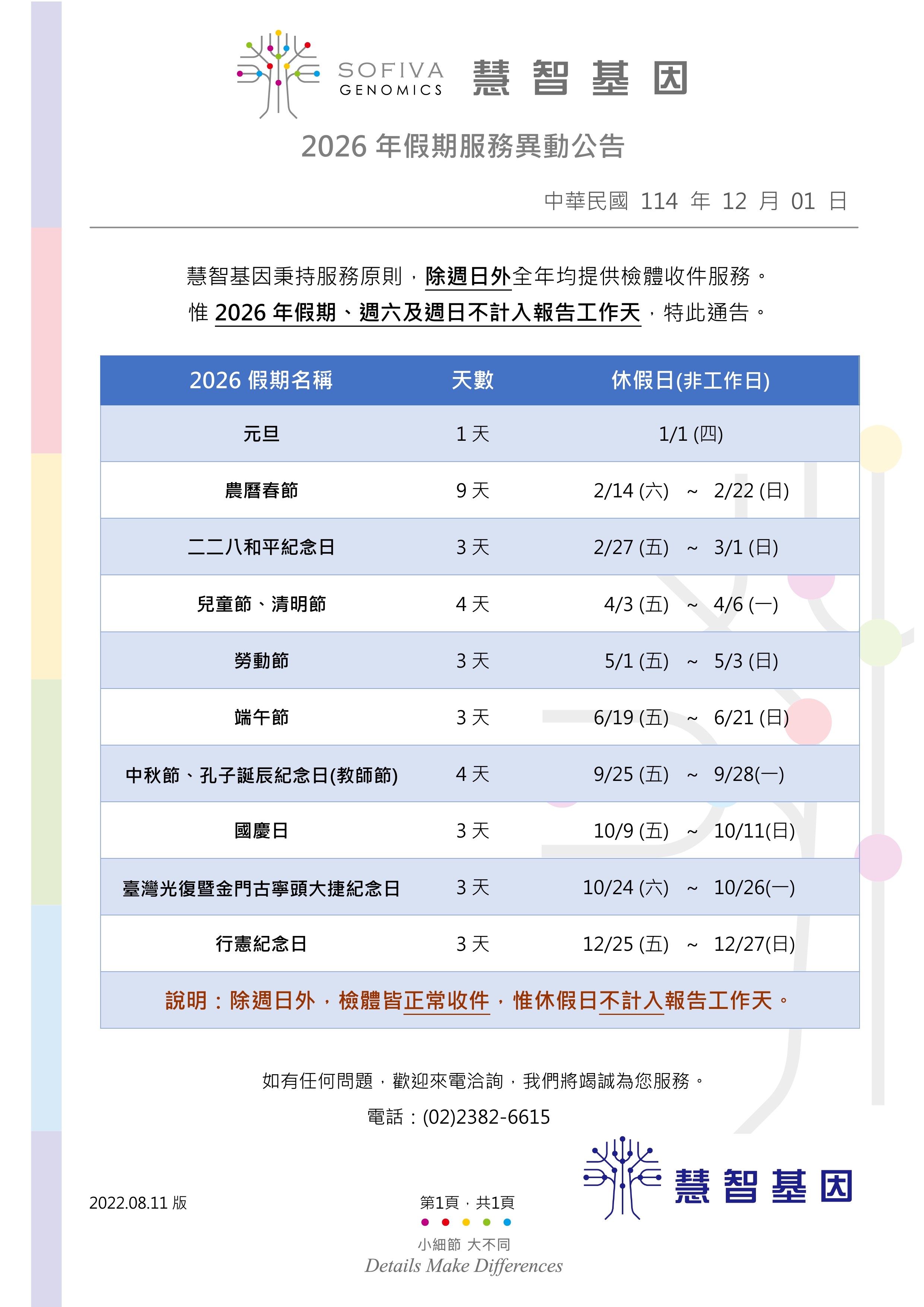 惟2026年假期、週六及週日不計入報告工作天,特此通告。