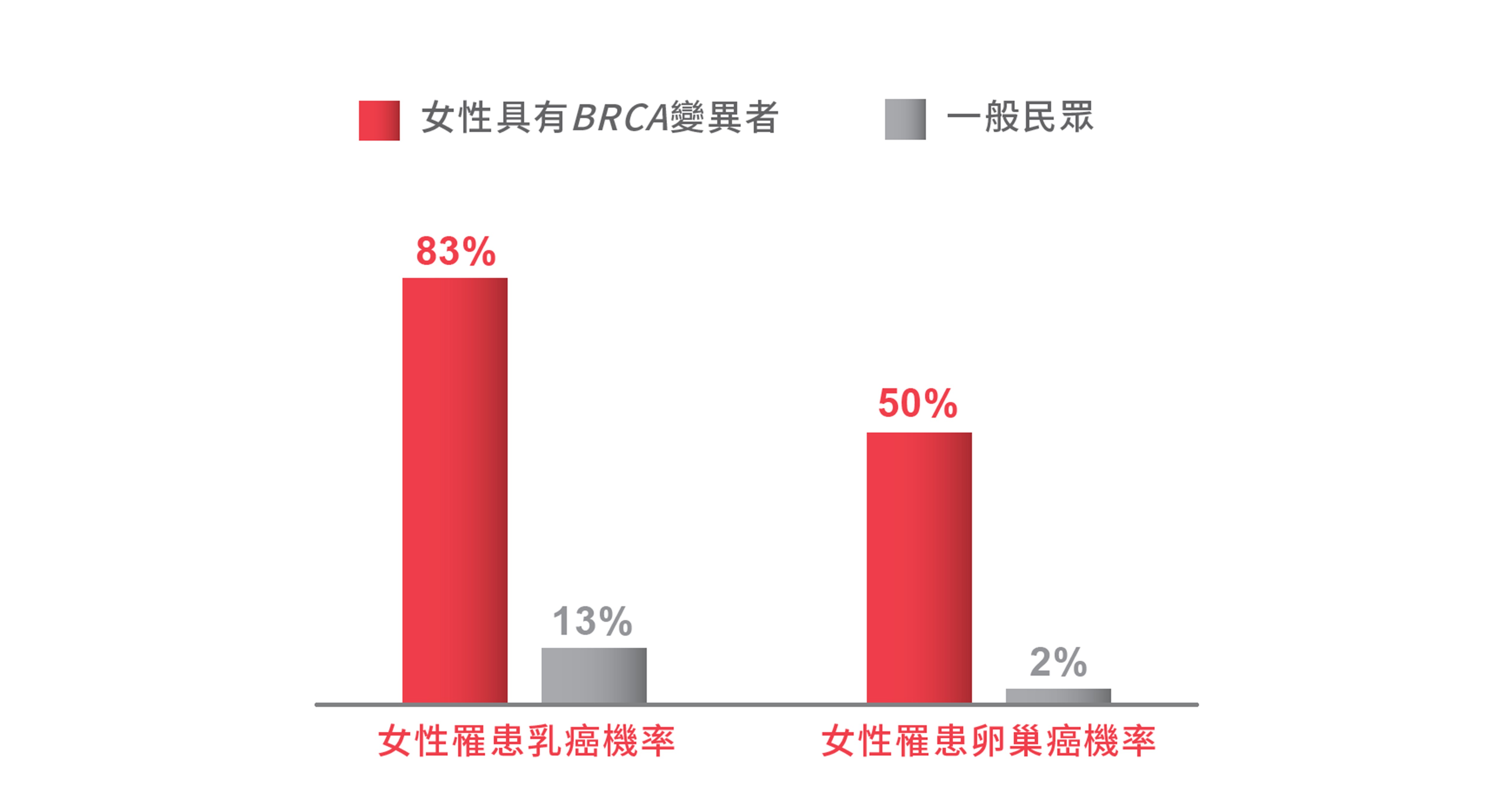 BRCA 1/2基因變異屬顯性遺傳,子女有50%機會得到異常基因,當得到遺傳性突變,則罹癌機率提高。